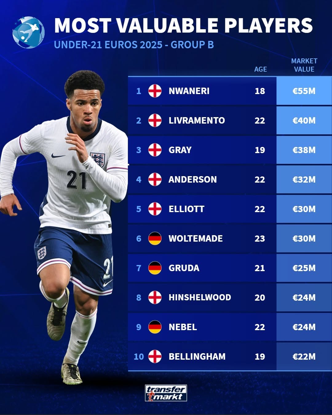 英格兰小将恩瓦内里以5500万欧元领跑榜单,英格兰和德国球员包揽了榜单前十。